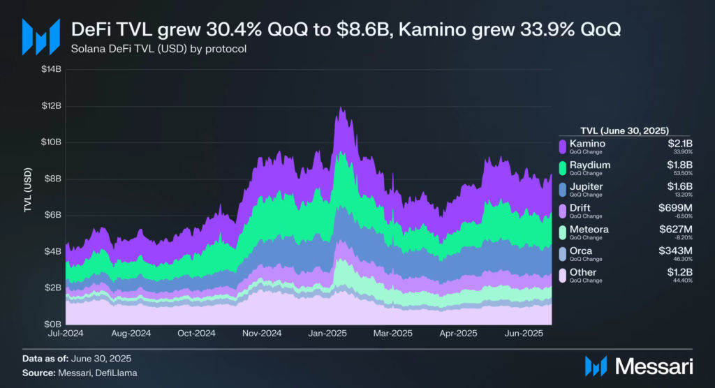 市場全体が落ち込む中でも、Solana DeFiは堅調な成長を示した。特にKaminoの安定した拡大は、Solana上の金利・担保市場の中核として定着しつつあることを示している。